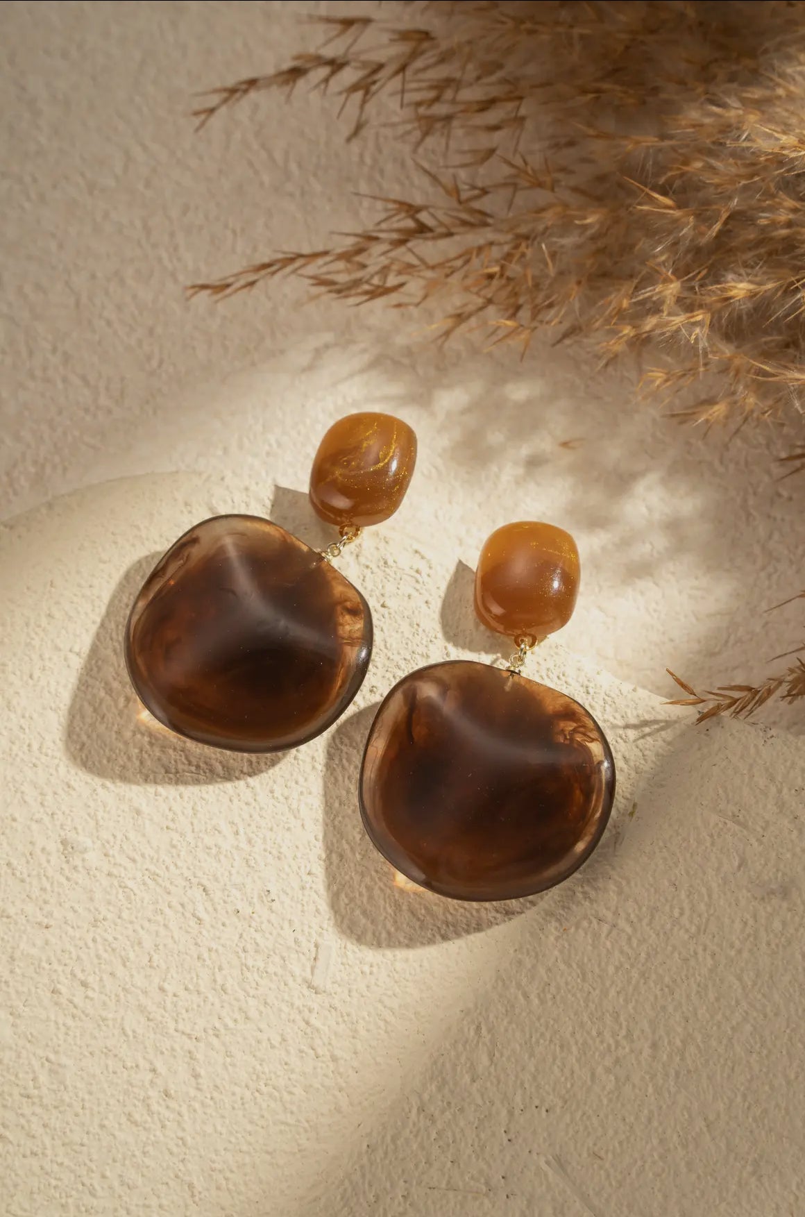 Boucles d’oreilles pendantes en résine ambre et résiné brillante, monter sur une tige en acier inoxydable doré